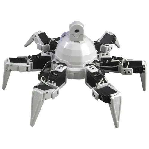 This EZ-Robot Revolution Six WiFi Hexapod is a creative robot platform. Assembled with EZ-Bits, Six is a very customizable robot with 6 legs and 12 degrees of freedom. The joints are powered by 12 heavy duty servo motors for unique dynamic movement abilities. The removable EZ-Bit joints and top mounted camera enhance interactivity with the world. Easily program new movements and interactions with the included EZ-Builder Software. Like all Revolution robots, Six is a great platform to customize with additional EZ-Bits using Clip 'n' Play technology. 12 female EZ-Clips surround the circular body and 1 female EZ-Clip on the dome. Simplicity inspires creativity!